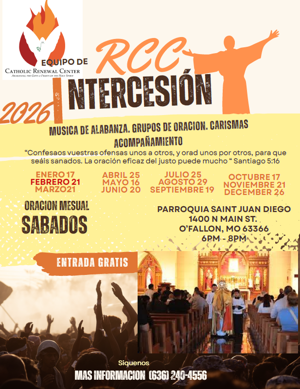 1 día – sábado 23 de mayo a partir de las 11am hasta 5pm en la Sala Fleur de Lis del Centro Cardinal Rigal. Continuamos con la celebración en el centro de Renovación Carismática Católica 6120 Pebble Hill Dr. Aftton, MO 63123.