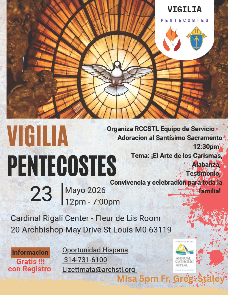1 día – sábado 23 de mayo a partir de las 12pm en la Sala Fleur de Lis del Centro Cardinal Rigal. Continuamos con la celebración en el centro de Renovación Carismática Católica 6120 Pebble Hill Dr. Aftton, MO 63123.